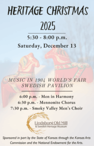 - Heritage Christmas 2025 is THIS Saturday, December 13, starting at 5:30 p.m. and running through 8 p.m.! Please join us for this cozy community tradition, including music performances – back in the 1904 World’s Fair Swedish Pavilion! – “A Shepherd’s Story of Christmas”, kids’ crafts, cookie decoration, visits with Santa Claus, tours of the Smoky Valley Roller Mills, the Mayor’s Christmas Kaffe (6-7 p.m.), and festive knitting for sale!