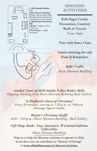 - Ongoing in December we have our critical Harvest of Giving 2025 year-end fundraising event. Our topline goal is $50,000 in unrestricted donations to keep the museum lights on and the doors open in 2026. In the space of four years, a major source of public funding has gone from covering half of our annual expenses to less than 8%. Because of this, it is more important than ever for generous private donors, businesses, and organizations to step in and ensure that the rare experiences at the Museum continue to be available in 2026. Learn more and make your charitable donation today at www.oldmillmuseum.org/harvest-of-giving.