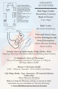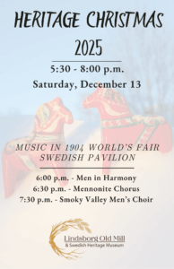 • We have finalized our program for Heritage Christmas 2025! See the full lineup below, and we look forward to having you here on Saturday, December 13! Poster flyers were distributed last week to Lindsborg businesses. Did we miss you? Please let us know and we’ll be glad to bring you one.